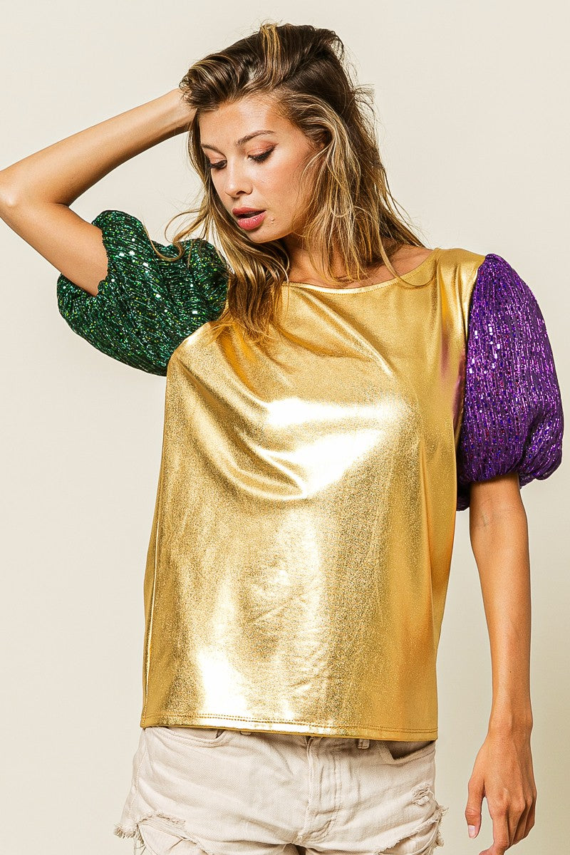 Mardi Gras Metallic Puff Sleeve Top